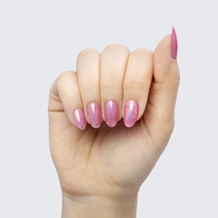 Bubble-gum pink. Muted. Medium. Iridescent shimmer. Opaque. Cool undertone.